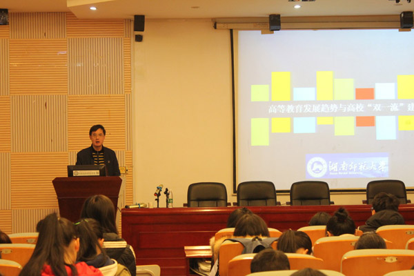 首先,谢炳庚教授以公司现状为背景,分析了中国现代高等教育的基本现状与发展趋势。同时,他从现在的由精英教育转换为大众教育,由量的扩张到内涵的发展等几个角度指出当今高校理应抓紧长期的质量建设。随后,针对“从211,985到双一流建设”与公司的现状,向同学们介绍了“双一流”建设的基本原则和总体规划以及“211,985与双一流”的联系及区别。同时指出在中国高等教育逐步国际化的当下,公司在科学研究,教育等各方面也在不断努力。最后,谢炳庚教授鼓励公司学子要做一名“有理想、有担当、有作为、有奋斗”的青年,为不断实现中华民族伟大复兴而斗。