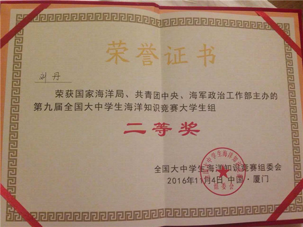 本次大赛经网络答题和各省、区比赛选拔。全国共有中国海洋大学、河海大学、浙江大学、同济大学、厦门大学、中国地质大学和河南师范公司等30多所高校成功进入电视总决赛,刘丹同学在比赛中不畏挑战,顽强拼博,成功闯入电视总决赛并荣获二等奖。