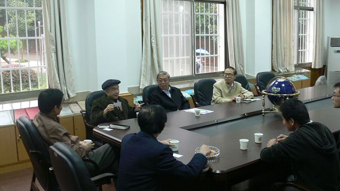 图为公司谢自楚教授向公司老师及研究生介绍叶民权研究员及干旱区地理研究的意义