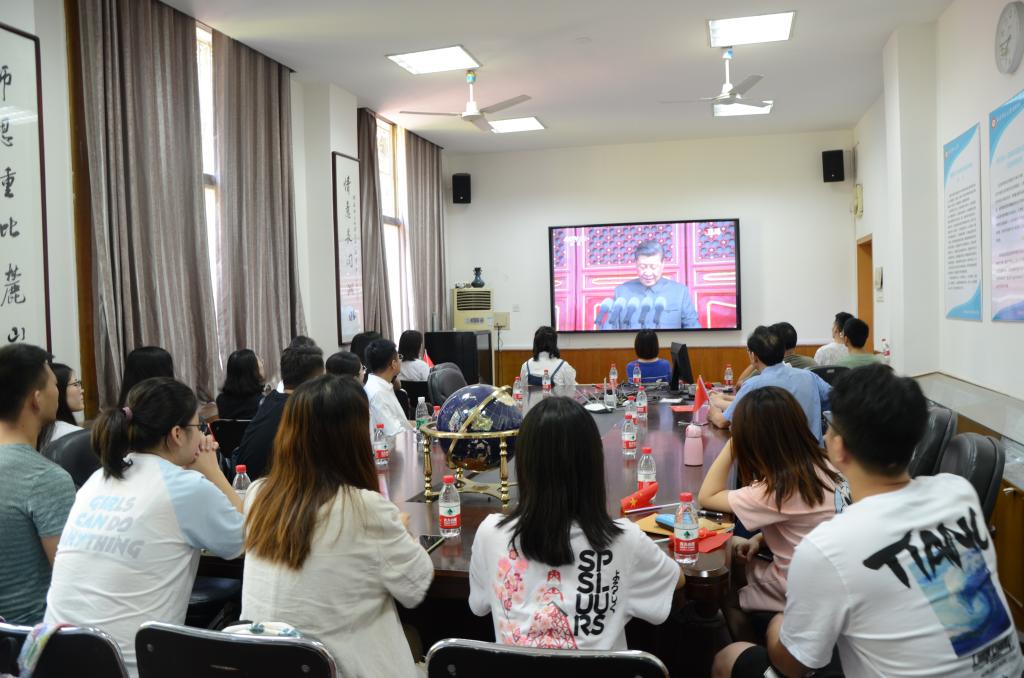 七十年砥砺奋进,七十年振奋人心。现场师生集体观看了习近平主席的演讲,受阅部队的阅兵式,十万群众的爱国游行。在场师生深入鼓舞,伴随着直播一起挥动手中的国旗,一起唱起爱国的歌曲,表达自己对祖国由衷的骄傲与自豪,极大振奋了在座师生的爱国热情和民族自信心。