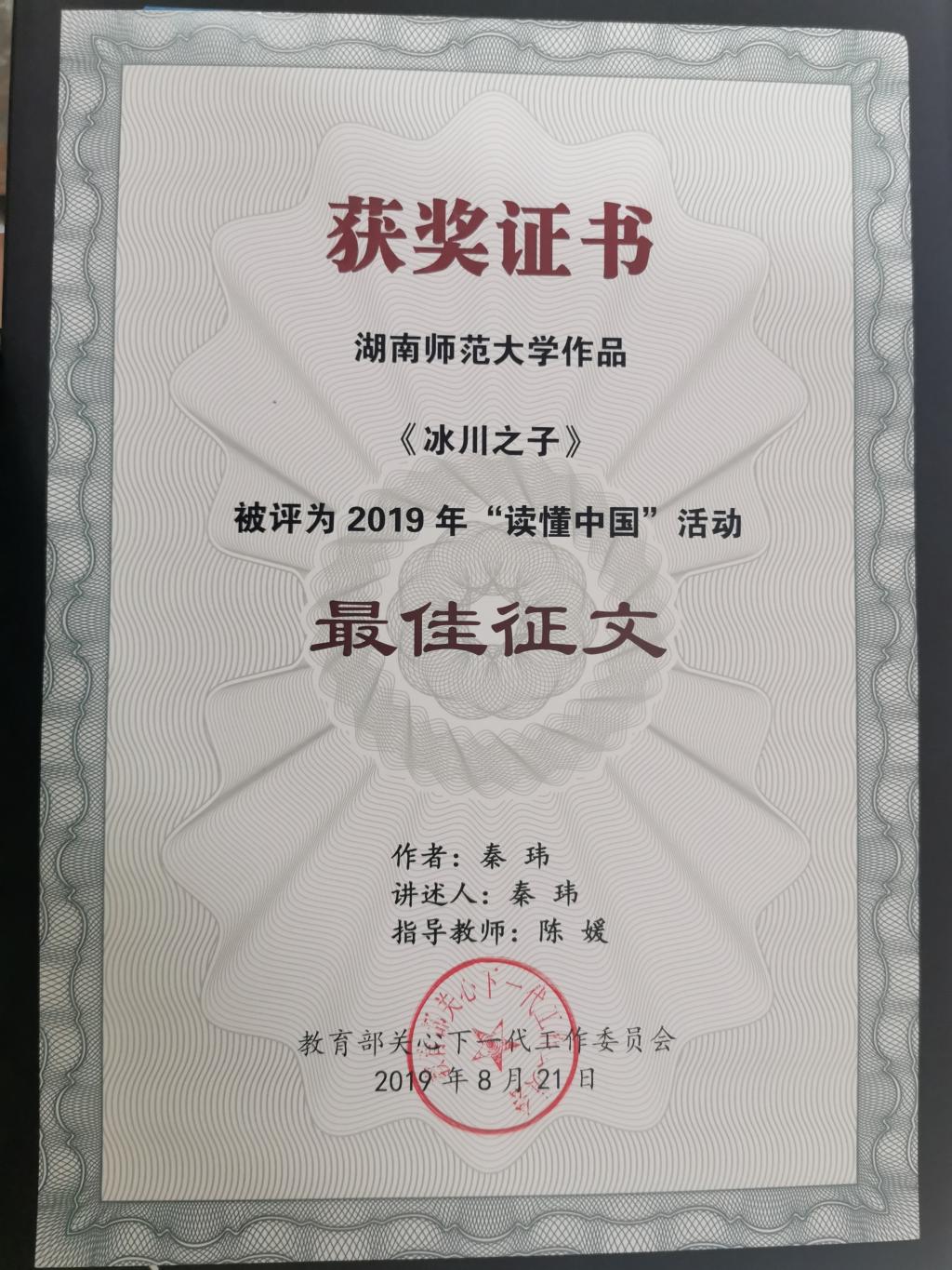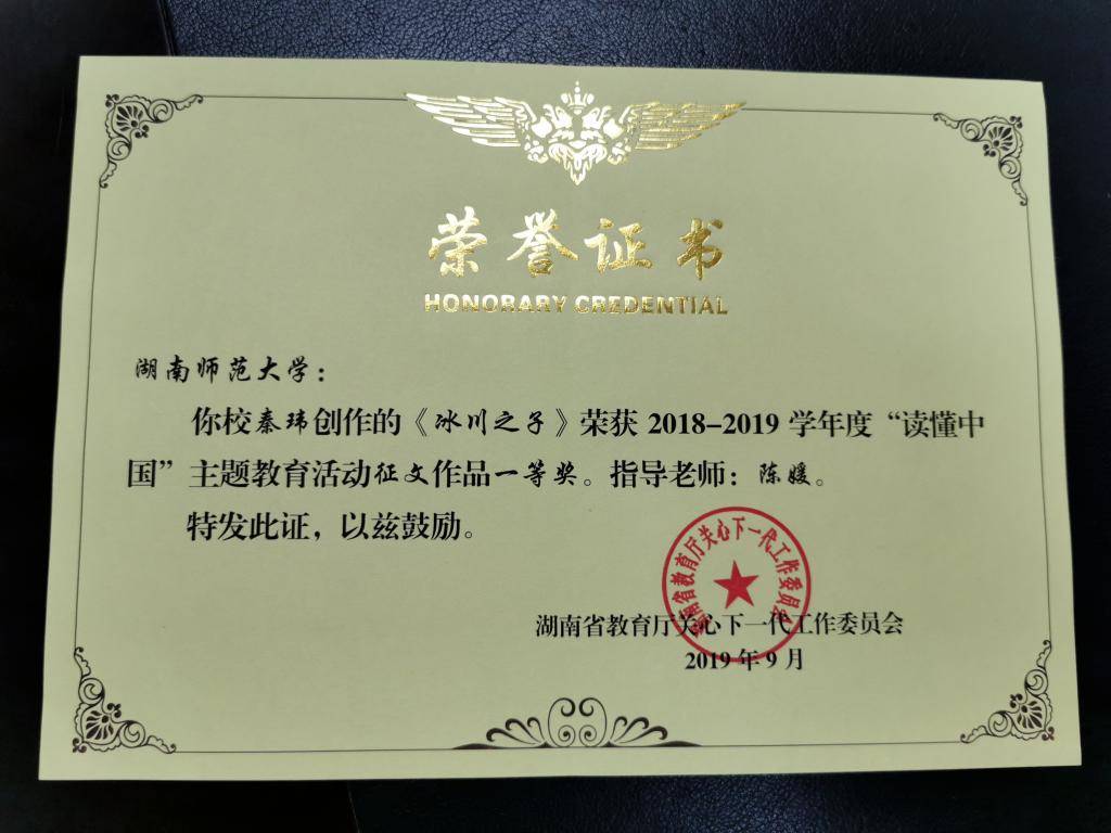 《冰川之子》在湖南省普通高校“读懂中国”主题教育活动征文比赛中,从全省63所普通高校,719个院系,30多万员工中脱颖而出,获评“湖南省一等奖”。连同其余11篇省级优秀征文作品,共同被报送至教育部关工委“读懂中国”活动组委会进行角逐,最终在全国各省优秀征文中,获评“最佳征文”。