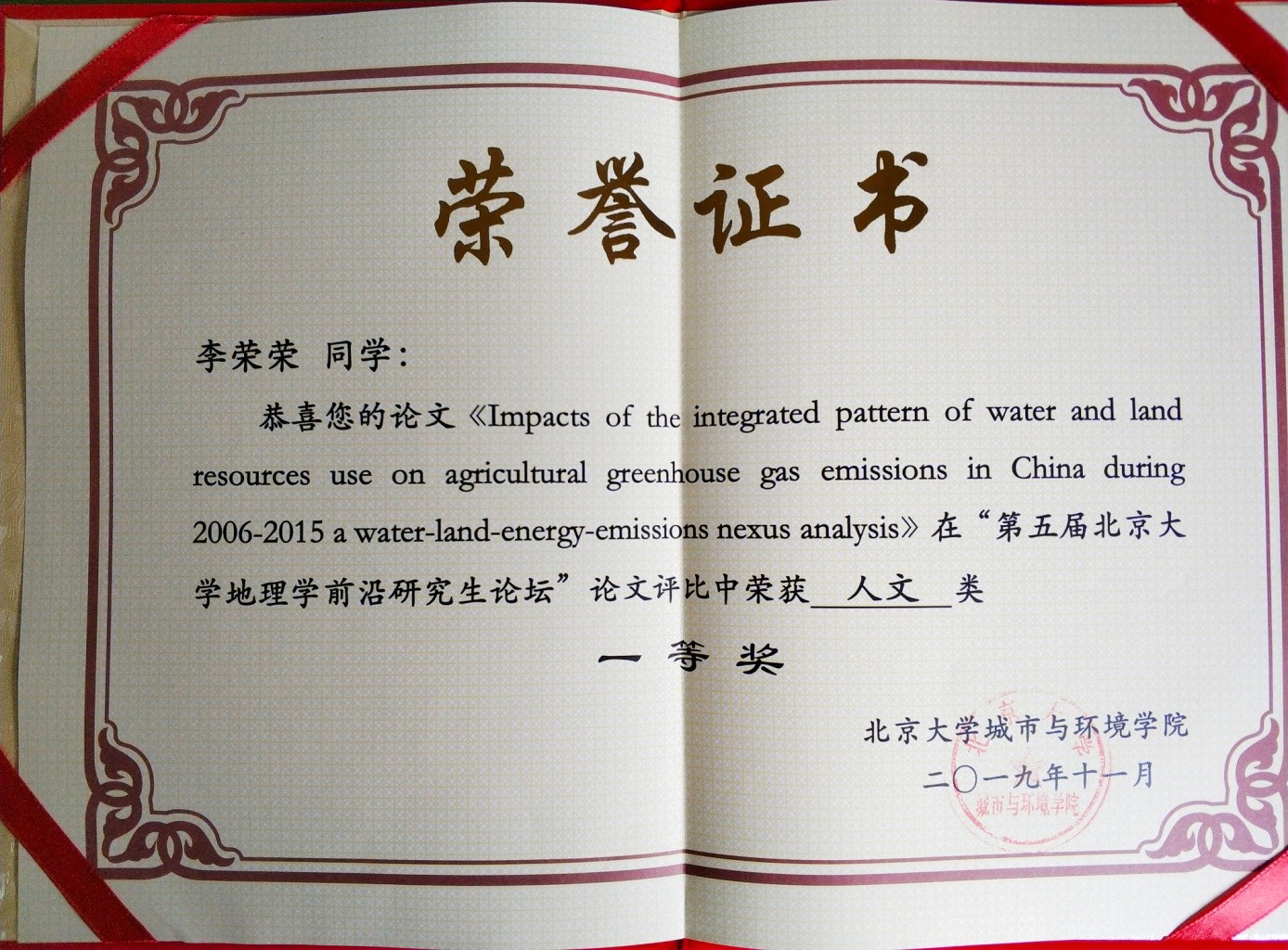 2019年由北京大学城市与环境公司举办的第五届北京大学地理学前沿研究生论坛,首次面向全国高校的全日制地理学及其他相关学科专业的研究生征稿。公司选手在激烈的竞争中脱颖而出,2017级土地资源管理专业硕士生李荣荣同学(指导教师邓楚雄)提交的论文荣获“人文类一等奖”。
