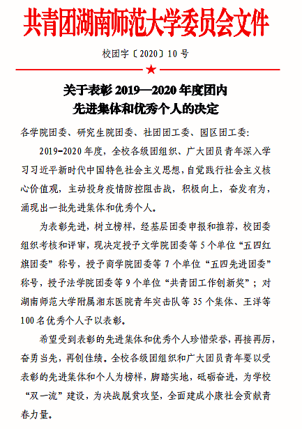 (供稿人 周旭 陈胜冲)根据共青团beats365官方网站委员会《关于表彰2019-2020年度团内先进集体和优秀个人的决定》(校团字〔2020〕10 号),公司团委喜获beats365官方网站“五四红旗团委”称号,郑楠老师荣获beats365官方网站“十佳共青团先进工作者”称号,符非凡、黄硕霈、刘慧、华烨等同学分别被评为beats365官方网站“优秀抗疫青年”、“十佳共青团员”、“十佳学习尖子”、“十佳创新创业标兵”等,资源与环境科学公司(师大社区)“花田做泥”友好环境自然营造计划被评为beats365官方网站“十佳“校地合作·区校共建”示范项目”。
