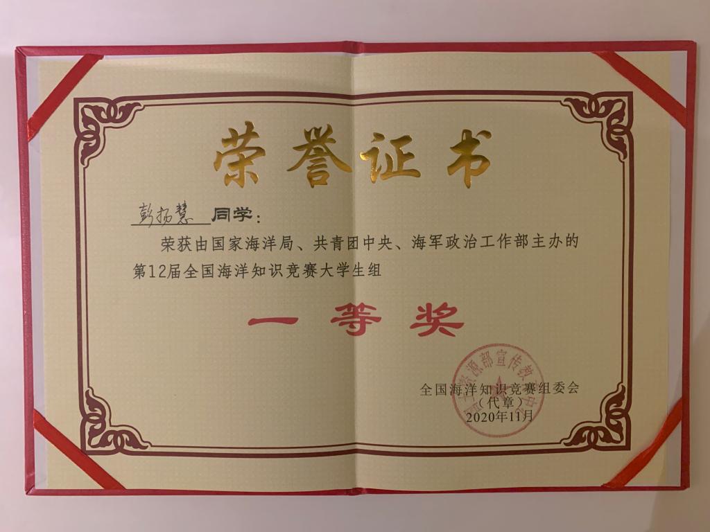 此次竞赛主题为“保护海洋,人与自然和谐共生”。比赛通过公司选拔、地区选拔、海军院校和网络答题等四种方式进行选拔,最终进入总决赛的有来自同济大学、浙江大学、南京大学、厦门大学等国内多所高校的60名选手。第一轮“60进10”的比赛在11月22日晚进行,彭扬慧同学通过了“一锤定音”、“不可多得”、“一站到底”3个环节的考验成功晋级全国十强。