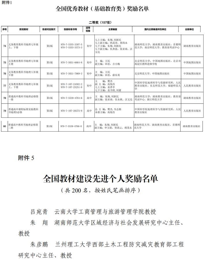 在本次评选中,公司朱翔教授荣膺“全国教材建设先进个人”称号,由朱翔教授主持编写的《义务教育教科书地理七年级上、下册》《普通高中教科书地理必修第一册》《普通高中教科书地理必修第二册》等三部教材被授予“全国优秀教材基础教育类二等奖”。