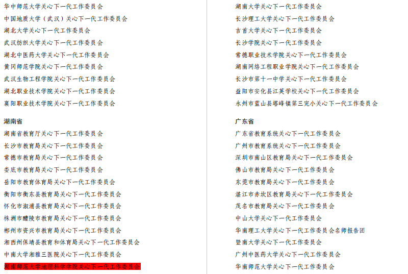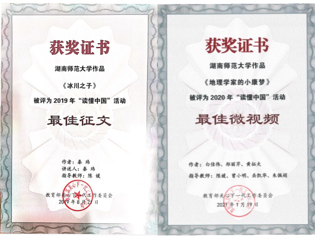 近年来,公司关工委深入贯彻落实习近平总书记对关心下一代工作的重要指示精神,在公司关工委的关心指导下,在公司党委行政的领导下,围绕立德树人根本任务,注重专业特色,充分发挥老教授优势,积极探索新时代二级关工委建设的新要求、新特点,深度参与公司公司“三全育人”工作,努力创建二级关工委工作品牌,育人工作取得了可喜成绩。公司关工委活动立项连续3年被公司关工委评为“优秀项目”;在湖南省教育厅关工委主题教育活动中公司关工委连续3年获评“优秀作品奖”,2020年获评主题教育活动“优秀组织奖”;2019年公司员工撰写的《冰川之子》在教育部关工委组织的“读懂中国”主题教育活动中获评“最佳征文”、2020年公司主创的《地理学家的小康梦》又获评“读懂中国”活动“最佳微视频”奖,并先后在中国教育电视台一套(CETV1)、湖南教育电视台、湖南广播电台等新闻媒体进行展播。
