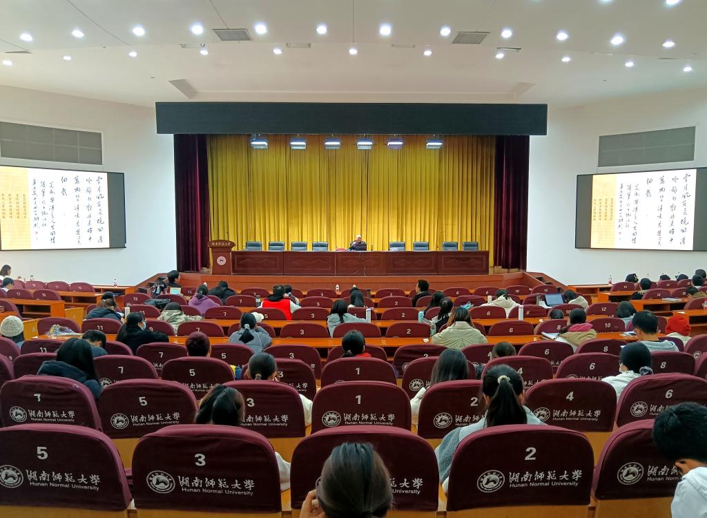 讲座开始,向彬教授从何谓美感、美从何处寻、如何营造自己的诗意人生三个方面开展此次讲座。向彬教授在讲授中通过展示了其创作的书法、诗词等作品,向同学们阐释了何为美,何为艺术,如何将自然审美和艺术审美相连接和转化。最后向彬教授又从心理学观点提出了自己对美与美感,移情作用,观念联想,寓情于景,情景交融的看法。