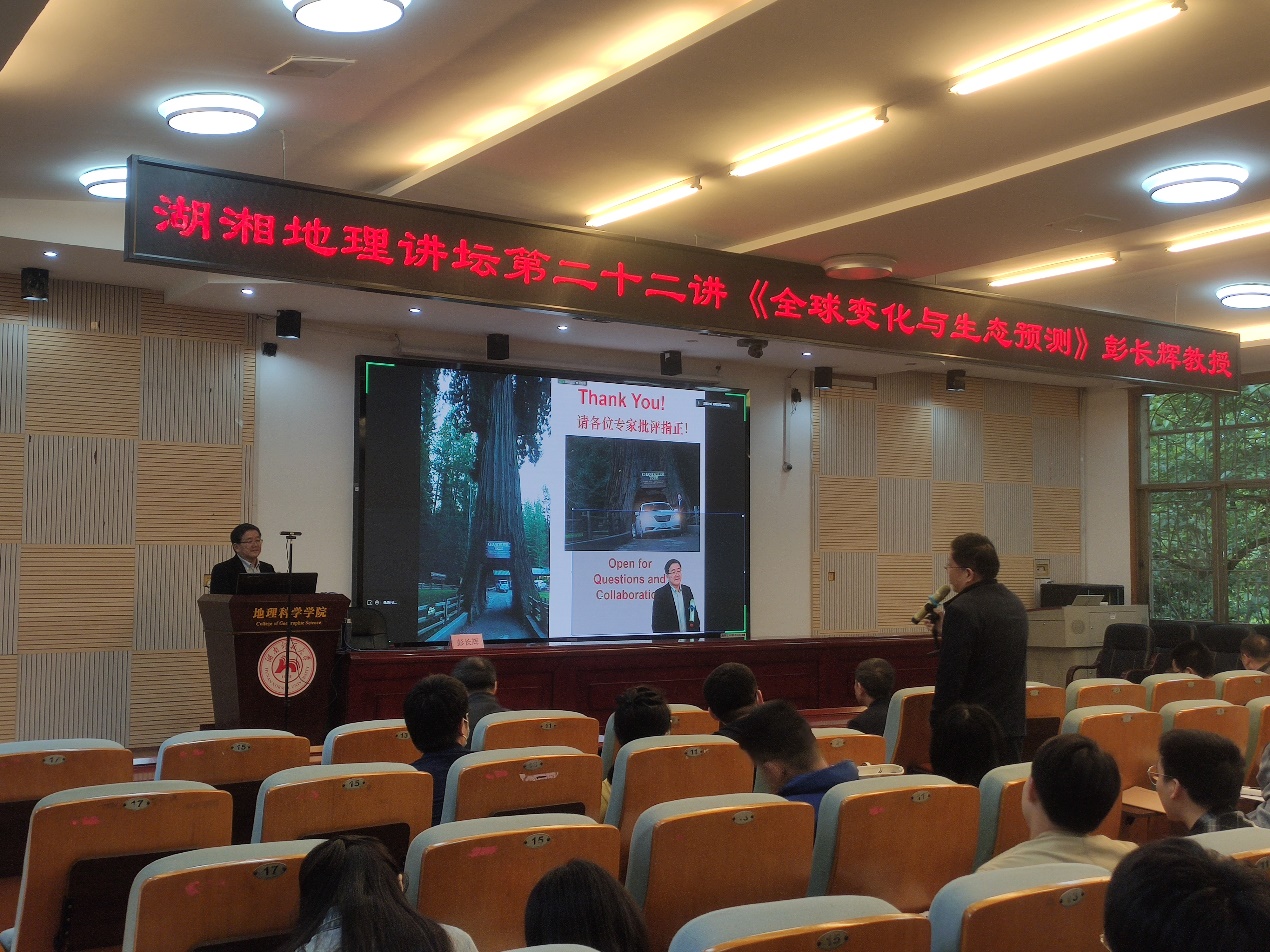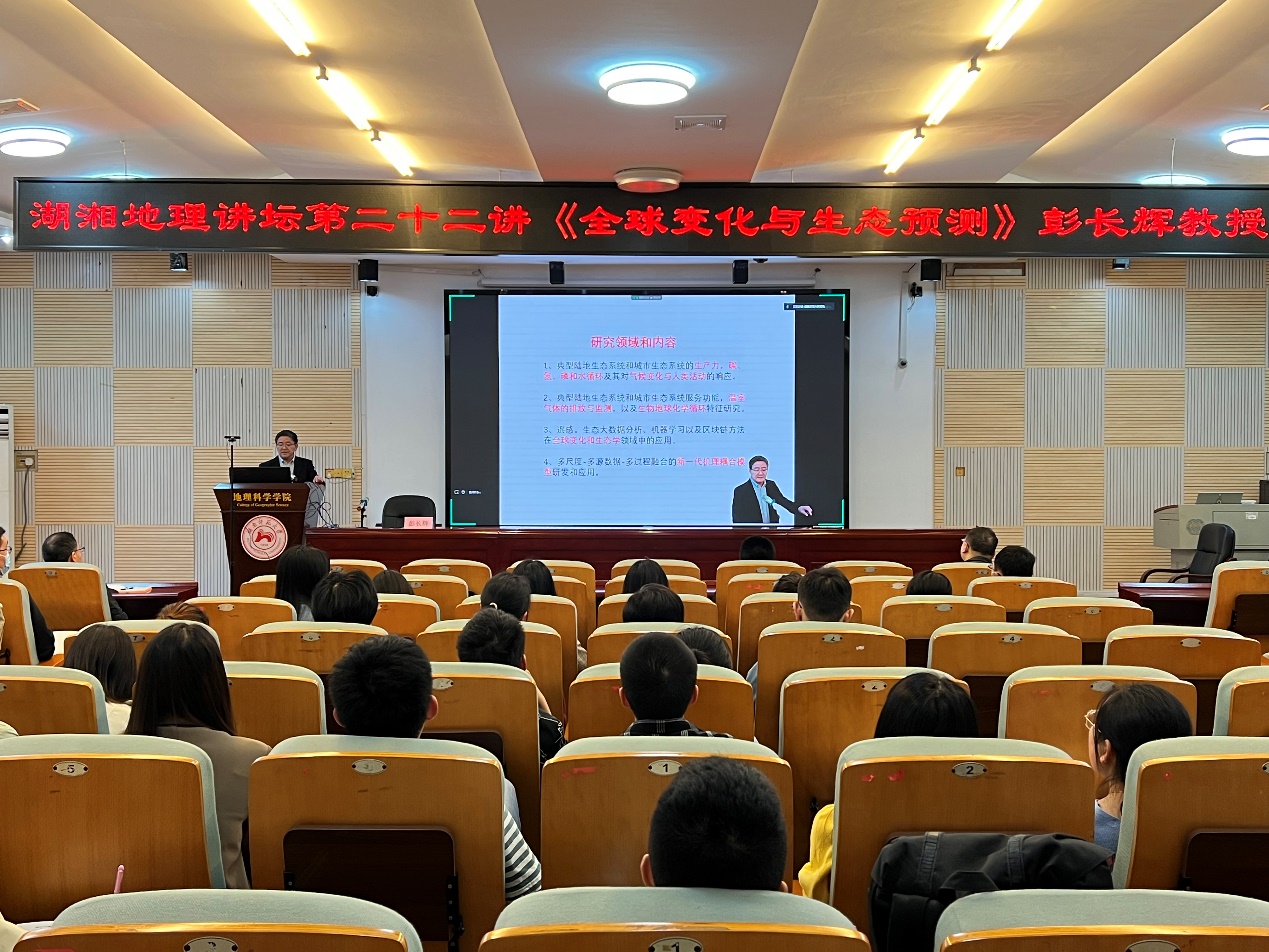 2022年5月19日下午,公司在经纬楼301报告厅举办湖湘地理讲坛第二十二讲——全球变化与生态预测前沿专题讲座。讲座由beats365官方网站“潇湘学者”特聘教授、魁北克大学终身教授、美国科学促进会会士(AAAS Fellow)彭长辉教授主讲,公司彭渤教授、毛德华教授、饶志国教授、贺新光教授等100余名师生线上或线下参加了讲座。讲座由公司经理周国华教授主持。
