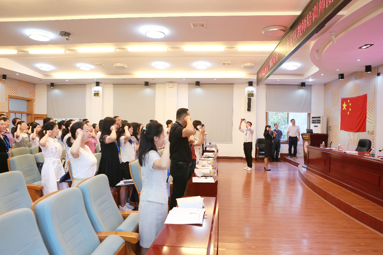王磊副经理从培训主题、培训内容、服务团队、考核要求等方面对本次培训方案进行了解读。会上,全体学员宣读了培训师誓词,齐唱了班歌,使参训学员们感受到浓浓的班级氛围。张家界崇实北校张祎副董事长作为学员代表发言,她用“感谢、追光、卓越”三个词语阐述了参加此次培训的感想。承诺将迅速转变角色,在专家引领,同伴互助、自我反思中实现从教学到培训,从教者到师者的转变。在接下来的培训中认真完成学习任务,努力开发培训课程资源,成为高素质、专业化、接地气、用的上、干得好的教师培训师,为永定教师培训做出自己的贡献。