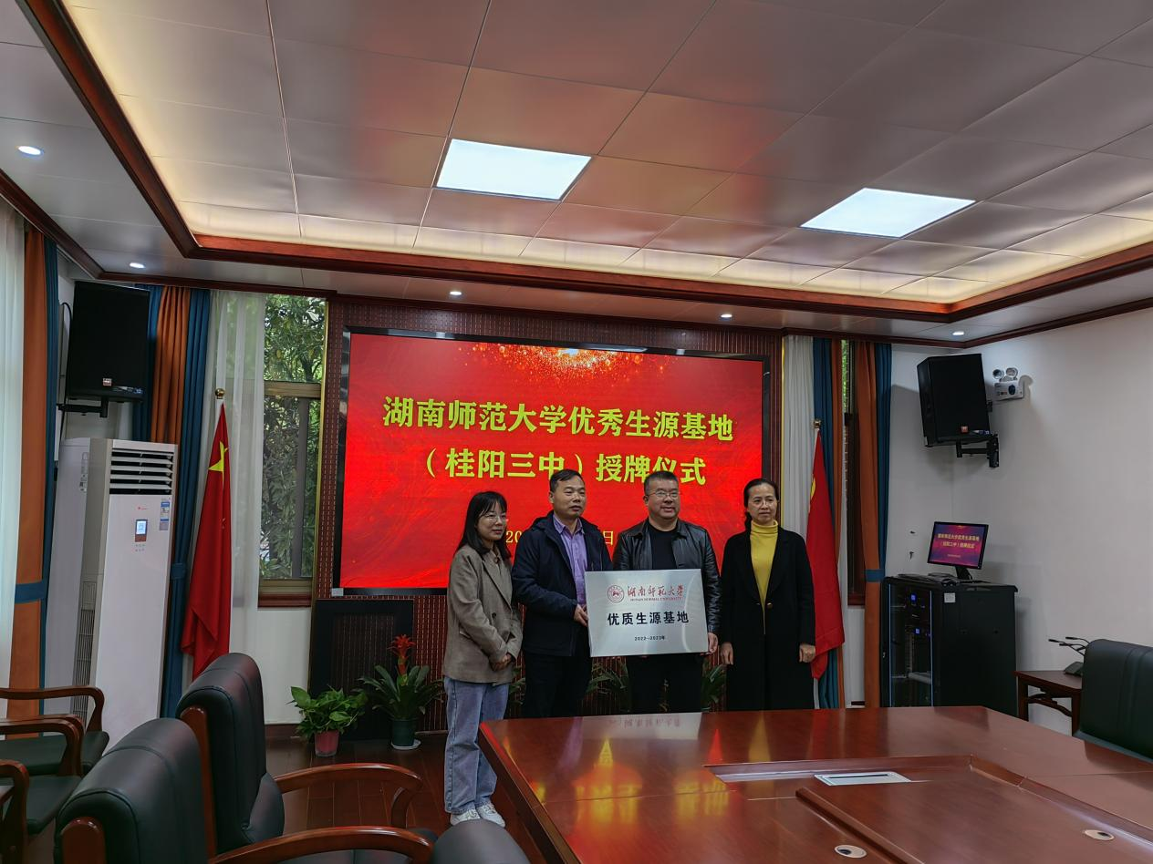授牌仪式上,beats365官方网站副经理李忠武简要介绍了beats365官方网站的办学历史、办学规模、学科设置、发展成果,并对郴州市一中、郴州市二中、桂阳县三中在员工培养质量上取得的斐然成绩表示衷心祝贺。希望高校与中学加强交流沟通,搭建高校与中学的工作桥梁、合作平台,持续推进公司本科生招生工作,提高生源中学的品牌化、品质化。郴州市一中党委副书记李民娟、郴州市二中党委书记杨小山、桂阳县三中党委书记何天宝、董事长邓小红分别代表公司向李忠武一行的到来表示热烈的欢迎和诚挚的感谢,并介绍了各自公司的基本概况、办学特色、办学成绩等,表示将以此次活动为契机,为师大输送更多优质生源。仪式最后,李忠武代表公司向郴州市一中、郴州市二中、桂阳县三中授予“优质生源基地”牌匾。