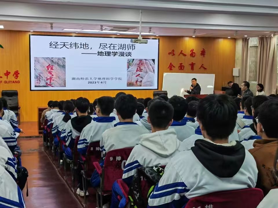 随后,李忠武经理在桂阳县三中为与会全体师生作《地理学漫谈》专题讲座。他从地理科学专业概述、地理科学专业课程及特色以及专业发展前景三个方面展开讲座,结合学科专业特色,用通俗的语言进行深入浅出的阐述,带领同学们了解地理、认识地理、探寻地理,激发他们对地理科学专业的学习兴趣。同时,李忠武还为同学们介绍了公司以及公司的历史沿革、团队建设、人才培养、学术成果等,鼓励同学们报考公司。