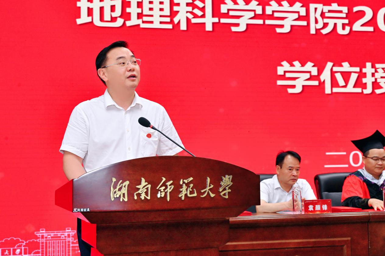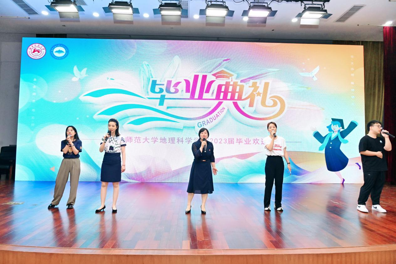 陈媛最后表达了母校对毕业学子的关切,祝愿同学们前程似锦、未来可期。她希望同学们将师大的一切永远留在记忆中,牢记“仁爱精勤”的校训和“经天纬地、格物明理”的院训,志存高远、脚踏实地,牢记自己是师大学子、师大地科人。