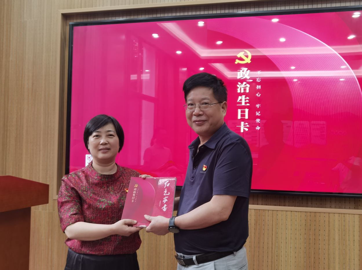 陈媛副书记以“时刻保持解决大党独有难题的清醒和坚定”为主题上了一堂党课,系统讲述了中国共产党作为世界上最大的马克思主义执政党独有难题的集中表现、独特成因和破解之道,并与参会党员同志们进行了深入的探讨交流。然后开展了党员同志集中过政治生日活动,陈媛副书记为这些同志赠送了一张政治生日卡和一本党建教育读物《红色家书》,并寄语他们。党员同志们集中观看了教育短片《如何理解摆在首位的“务必不忘初心、牢记使命”》,并重温了入党誓词。
