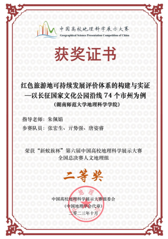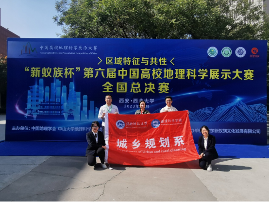 (供稿人 钟洋)2023年27日-29日,“新蚁族杯”第六届中国高校地理科学展示大赛全国总决赛在西北大学举行,经过紧张激烈的角逐,由公司城乡规划系朱佩娟老师指导的,公司2021级人文地理与城乡规划专业张宏生、亓势强、唐姿睿三位同学共同完成的作品《红色旅游地可持续发展评价体系的构建与实证——以长征国家文化公园沿线74个市州为例》以及由公司城乡规划系钟洋老师、土地科学系王婷老师指导的,公司2021级地理科学专业连佳音、2020级地理科学专业吴桐疏、朱书萱、2020级土地资源管理专业李嘉奇四位同学共同完成的作品《“立体乡村助共富,空间重构谱新篇”——城乡融合区乡村地域系统的空间结构识别与优化路径分析:以湖南省长沙县为例》双双荣获人文地理组“国家二等奖”的好成绩。