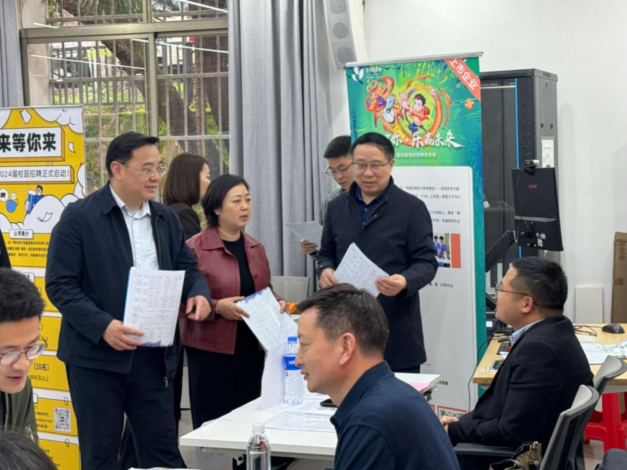 动员会后,公司在经纬楼227教室举办了2024届毕业生春季专场招聘会,公司经理周国华、党委书记刘忠耿、党委副书记陈媛出席本次招聘会,与各用人单位和应聘员工亲切交流,了解单位招聘与员工就业情况。