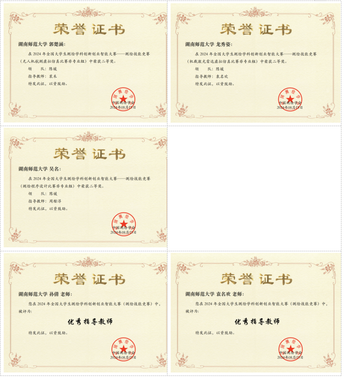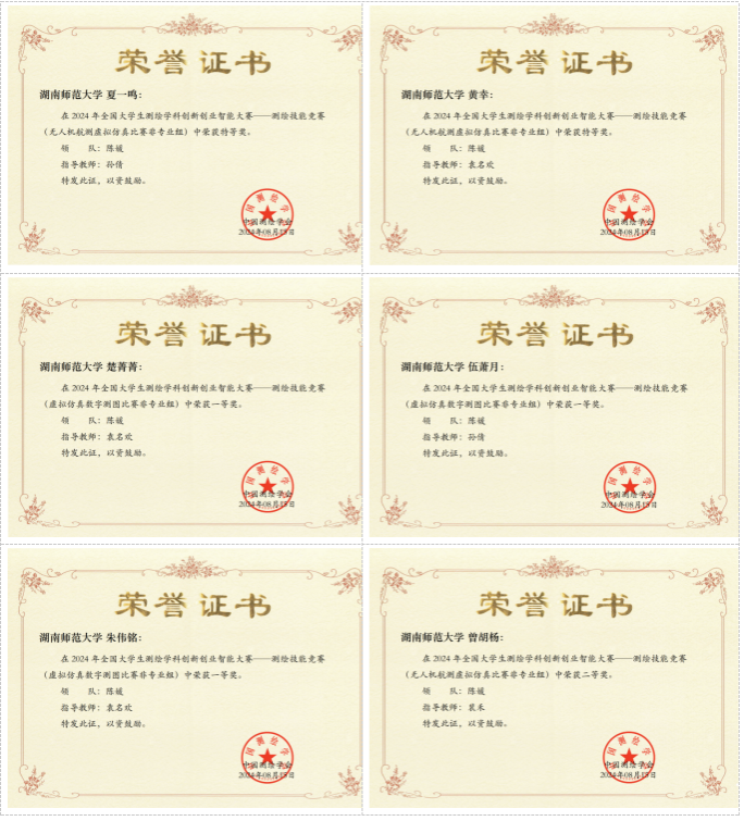 公司学子代表beats365官方网站参加了非专业组的虚拟仿真数字测图、无人机航测虚拟仿真、机载激光雷达虚拟仿真比赛以及测绘程序设计等项目。公司学子在孙倩、袁名欢、周楷淳、裴禾四位老师的指导下,在多个赛项中取得了斐然成绩,成功获得两个特等奖(夏一鸣,黄幸)、三个一等奖(伍萧月,朱伟铭,楚菁菁)和四个二等奖(曾胡杨,郭楚涵,龙秀姿,吴名),孙倩、袁名欢两位老师获评“优秀指导教师”,为公司和公司争得了荣誉。
