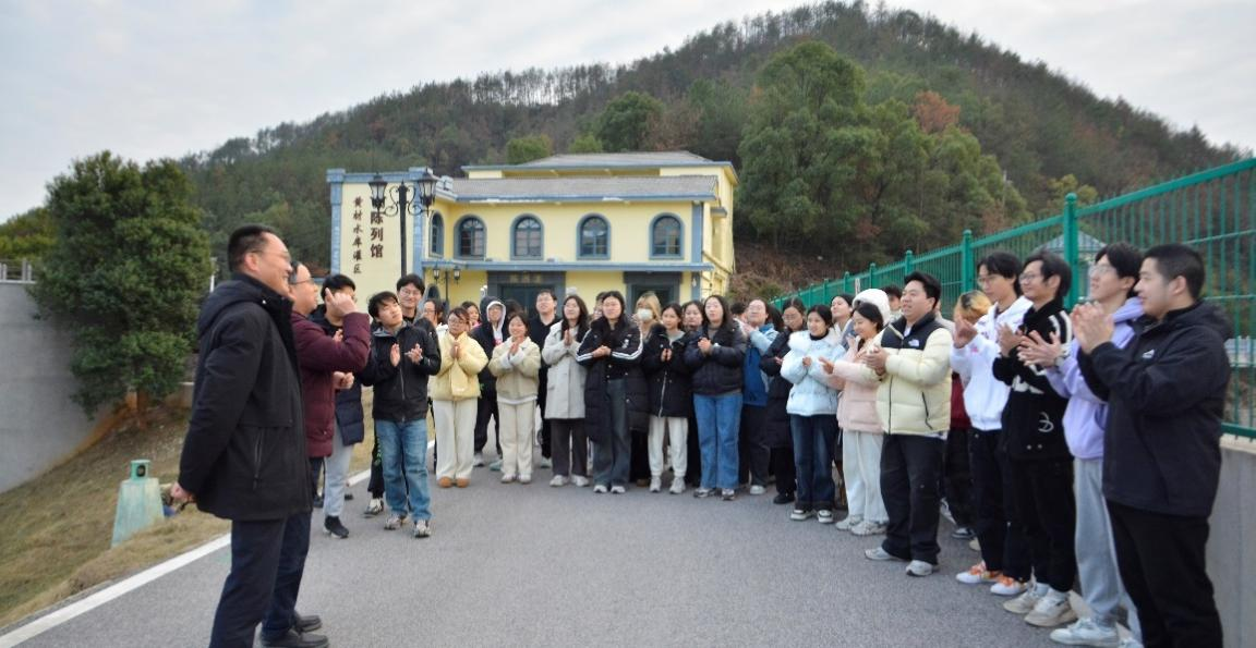 继续向西,来到此次实习的最后一站——黄材水库。来到水库大坝上,俯瞰水库内外的冬日生态风光和山脚的人间烟火。公司员工艾志军主任向员工们介绍了水库建设历史及其基本情况,介绍了水库建设及其与当地农业与城镇发展的关系。老师们引导员工思考黄材水库选址、建设管理及功能作用的变化,强调水利设施建设的重要性及其水库多功能作用的发挥与永续利用。