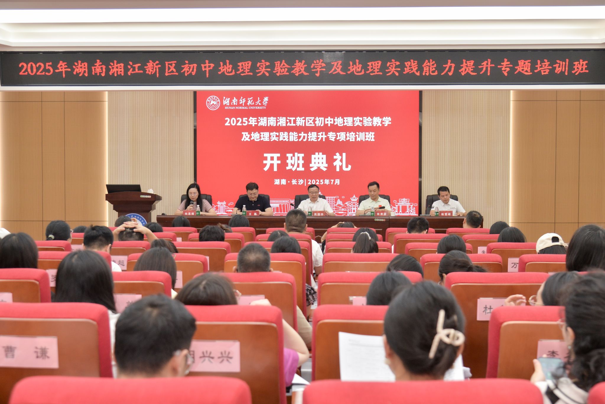 (供稿 秦雅静)7月7日,2025年湖南湘江新区初中地理实验教学及地理实践能力提升专项培训班在公司301报告厅举行隆重的开班典礼。湖南湘江新区教师发展中心书记、主任林涌波、地理教研员、师训室主任杨雪峰,公司经理周国华、副经理王磊以及来自湘江新区的80位优秀的初中地理教研组长及骨干教师出席了典礼,典礼由公司成教办主任向思煜主持。