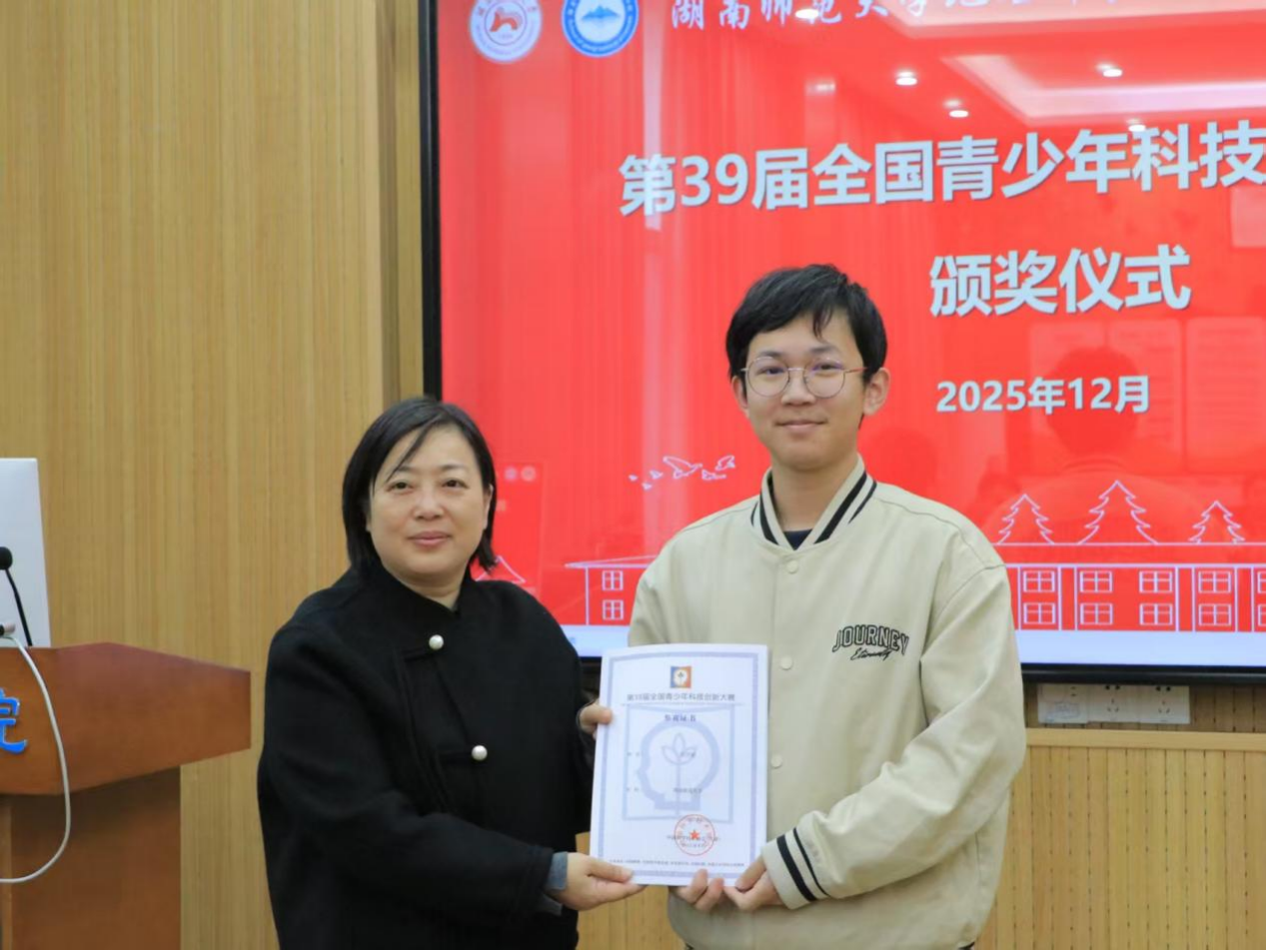 仪式伊始,陈媛首先向获奖的文靖灵、彭浩原两位同学表示祝贺,祝贺两位同学的作品凭借优异表现脱颖而出,在第39届全国青少年科技创新大赛中举得优异成绩。她指出该赛事由中国科技协会、共青团中央、中国地理科学学会等单位联合主办,具有深厚的历史底蕴与高含金量。此次颁奖是受中国地理学会委托为两名员工颁奖,希望借这场简约而庄重的仪式,传递对获奖学子的肯定。随后,陈媛与院学工办老师依次为文靖灵、彭浩原同学颁奖并合影留念,勉励他们再接再厉,再创佳绩。