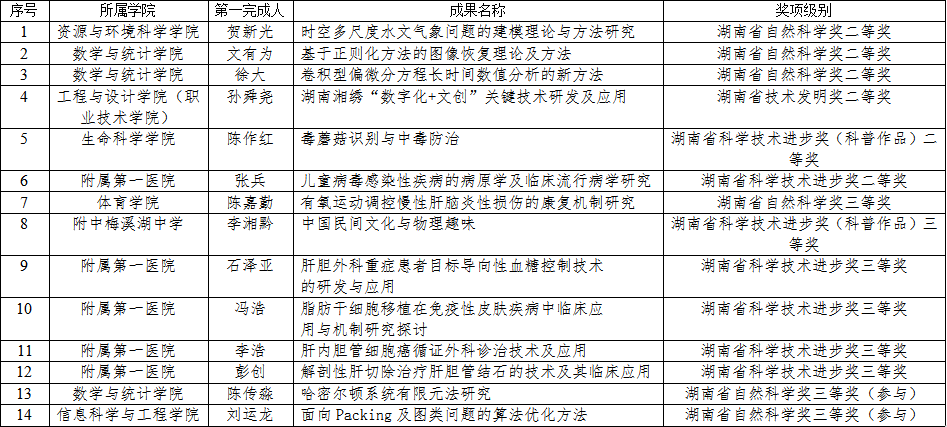 (供稿 科学技术处 资环公司)6月10日上午,湖南省科技创新奖励大会在长沙召开。公司14项研究成果荣获湖南省人民政府表彰,其中包括湖南省自然科学奖二等奖3项、三等奖3项(其中参与2项);湖南省技术发明二等奖1项;湖南省科学技术进步奖二等奖2项,三等奖5项,获奖总数创公司历年新高。公司贺新光(第一完成人)、章新平、秦建新、吴华武、陶俐芝团队的研究成果《时空多尺度水文气象问题的建模理论与方法研究》荣获湖南省自然科学奖二等奖。