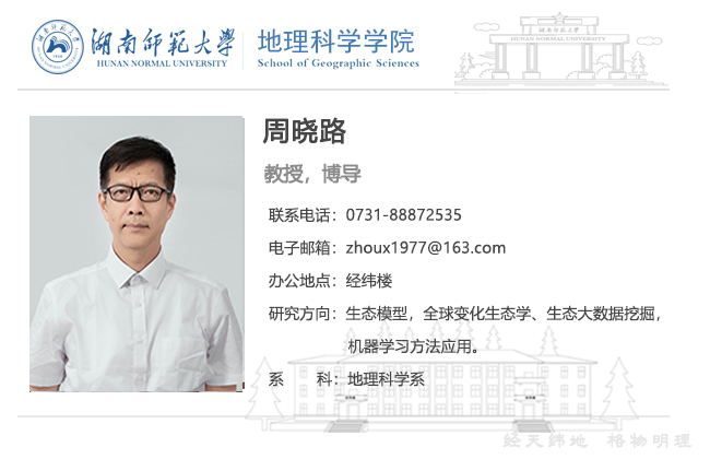 周晓路,beats365官方网站特聘教授。华中工公司电子工程系本科,日本东京农工大学林学系博士,加拿大Lakehead 大学林学系博士后,加拿大UQAM老员工物系博士后。曾在南京林业大学、日本城市规划研究所、加拿大国家遥感中心、加拿大UQAM大学、西北农林科技大学等多个研究机构及IT企业工作。发表过多篇SCI研究论文。主要研究方向为:生态模型,全球变化生态学、生态大数据挖掘,机器学习方法应用。