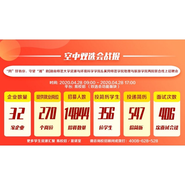 (通讯员 罗静伟)高校毕业生的就业工作是当前最紧迫、最重要的任务之一。公司在做好本院毕业生就业工作的同时,积极响应国家毕业生就业创业“一帮一”行动,结对就业工作特点相似的黄冈师范公司地理与旅游公司于4月28日通过“易校招”平台两校联合举办了““冈”好有你,守望“湘”助” 网上毕业生招聘会,实现就业信息的共享,为员工提供就业帮扶。招聘会当天报名申请参会的单位共有85家,通过公司筛选遴选出32家单位参会,共提供了270个就业岗位,有300多名员工投递了500余封简历,面试次数达400余次。