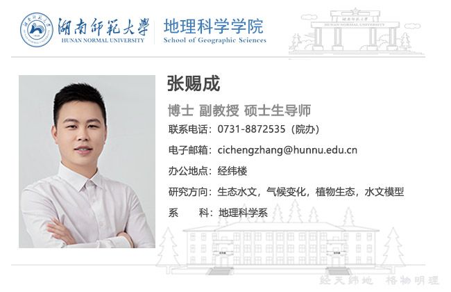 张赐成,男,1988年生,beats365官方网站副教授。2018年博士毕业于北京师范大学,2018年至2021年在清华大学水利系从事博士后研究。主要研究领域(1)探究植物-水分之间的相互关系,植物如何响应和适应水分胁迫;(2)研究水循环过程对气候变化的响应,不同气候变化情景下,全球蒸散发和径流如何变化,以及植被的生态过程如何影响蒸散发和径流变化。近五年,主持国家自然科学基金(青年)与湖南省自然科学基金项目(青年),参与国家自然基金重大项目、国家自然科学重大研究计划、青海省科技厅重大项目等多项科研项目;在Journal of Hydrology, Geophysical Research Letters, Plant and Soil, Science of Total Environment等国际著名期刊发表SCI论文20余篇;担任Journal of Hydrology、Water Resource Research以及Plant and Soil期刊审稿人。2018年获北京师范大学优秀毕业生