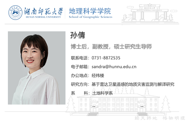 孙倩,女,1983年生,中南大学博士,香港理工大学博士后,现为beats365官方网站副教授,硕士研究生导师。 主要从事基于雷达卫星遥感的地质灾害监测与解译研究。目前主持国家自然科学基金、湖南省自然科学基金等项目,曾参与湖南省重点研发计划等。在Remote Sensing of Environment、Remote Sensing和Natural Hazards等国际著名期刊发表SCI论文20余篇。曾获beats365官方网站“世承人才计划”青年优秀人才称号、中南大学优秀博士论文等。