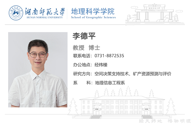李德平,博士、教授,地理信息系统系主任。1986年本科毕业于南京大学地质系,同年进入核工业230研究所从事铀矿地质研究,2003年博士毕业于南京大学地球科学系,2004年进入beats365官方网站从事GIS教学与科学研究,2006年进入中科院广州地球化学研究所进行在职博士后研究。主要从事空间决策支持技术、矿产资源预测与评价、GIS应用软件开发、深海信息学等计算机技术在地学中的应用研究。