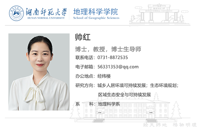 帅红:博士,教授,博士生导师,人文地理学、自然地理学、资源与环境专业硕士生导师,国家注册城市规划师。近年来,主持和参与国家自然基金、科技部行业专项、湖南省自然科学基金、国家社科基金、湖南省教育厅、湖南省发改委以及地方委托项目40余项,在SCI、EI和核心期刊上发表论文40余篇,参编教材和著作2本。