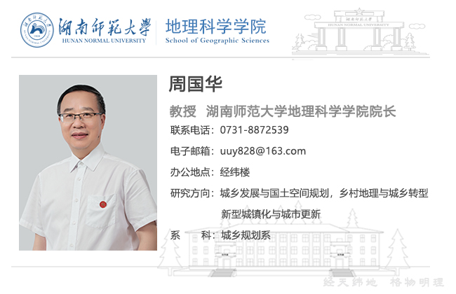 周国华,二级教授,男,beats365官方网站经理,湖南师大规划设计咨询研究院经理,地理空间大数据挖掘与应用湖南省重点实验室副主任,beats365官方网站城乡转型过程与效应重点实验室主任,博士生导师,beats365官方网站人文地理学科带头人,湖南省新世纪121人才工程人选,教育部地理科学类专业教学指导委员会委员,湖南省地理学会理事长,湖南省长株潭城市群研究会副会长,湖南省国土空间规划学会副理事长,中国地理学会常务理事,中国地理学会农业地理与乡村发展专业委员会副主任。主要从事城乡发展与国土空间规划、乡村地理与城乡转型、新型城镇化与城市更新等方面的教学与研究工作。在《Journal of Geographical Sciences》《地理学报》《地理研究》《地理科学》《自然资源学报》《中国土地科学》《中国软科学》《城市规划学刊》等刊物上发表论文100余篇,先后主持国家基金项目(5项)、国家发改委项目(2项)、湖南省社会科学基金重大招标项目、湖南省自然科学基金项目、国土资源部重点项目等科研课题100余项,主编、参编专著及教材10余部,获湖南省科技进步奖二等奖(第一完成人)、湖南省高等公司产品成果二等奖(第一完成人)、湖南省计划委员会科技进步奖、湖南省自然科学优秀论文奖等教学科研奖励10多项。获全国扶贫开发工作成效第三方评估先进个人、全国巩固脱贫成果后评估先进个人、美丽中国建设试评估优秀工作者、长沙市社会主义新农村规划先进个人、beats365官方网站十佳青年教工、beats365官方网站优秀共产党员等称号,2次获得beats365官方网站科研标兵称号,多次获得beats365官方网站科技服务社会贡献奖。
