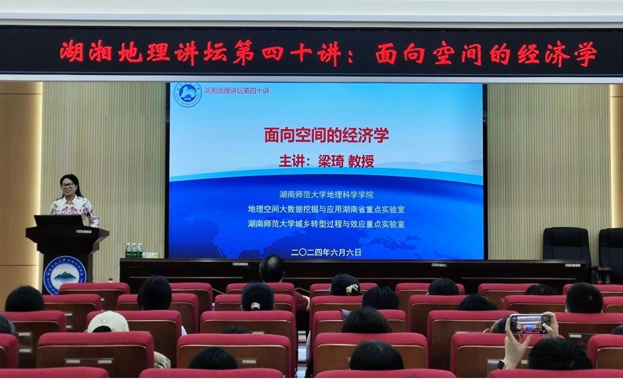 (供稿 马恩朴)2024年6月6日下午,公司在经纬楼301报告厅举办湖湘地理讲坛第四十讲——面向空间的经济学讲座。讲座由经济学博士、中山大学教授、博士生导师、全国百篇优秀博士论文奖获得者、中国区域科学协会空间经济学专业委员会主任梁琦教授主讲,公司经理周国华教授、副经理饶志国教授等100余名师生参加了讲座。讲座由公司经理周国华教授主持。
